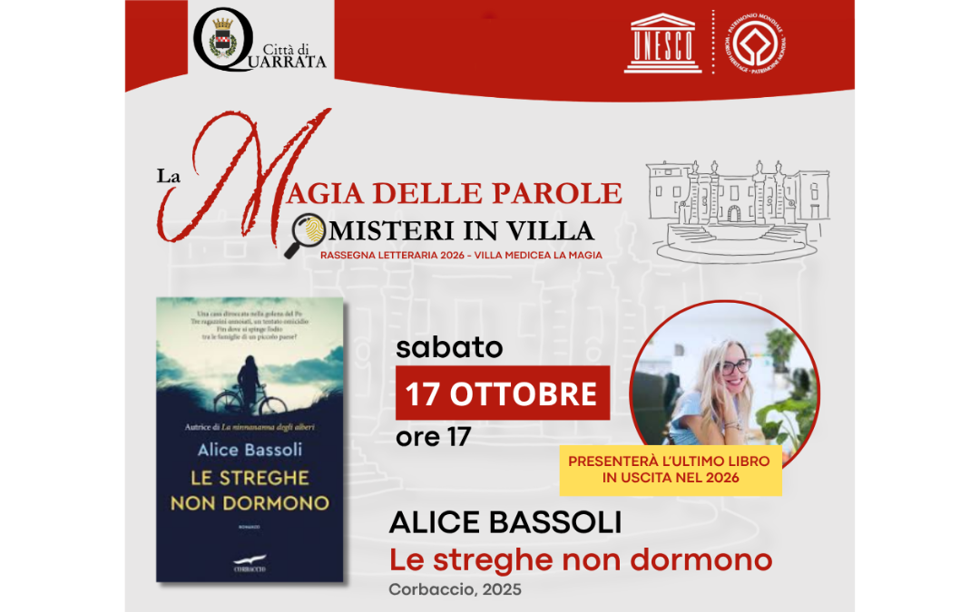 All’interno della rassegna “La Magia delle Parole. Misteri in villa”, l’autrice Alice Bassi presenta il suo ultimo romanzo in uscita nel 2026 nelle Scuderie della Villa Medicea La Magia sabato 17 ottobre 2026 alle ore 17.