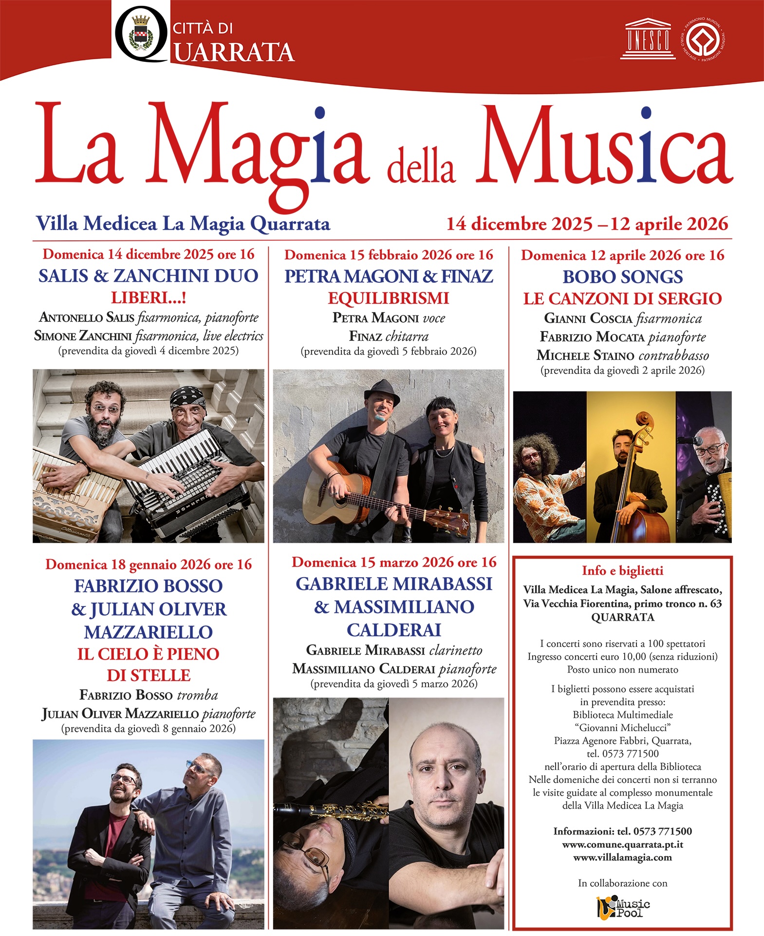 Evento curato dal Comune di Quarrata nella Villa Medicea La Magia, patrimonio UNESCO dal 2013. Dopo la chiusura dovuta prima alle misure sanitarie per il Covid-19 e poi ai lavori di restauro finanziati dal PNRR, tornano a risuonare le note nel salone affrescato. I concerti sono riservati a 100 spettatori, ingresso €10, posto unico non numerato.